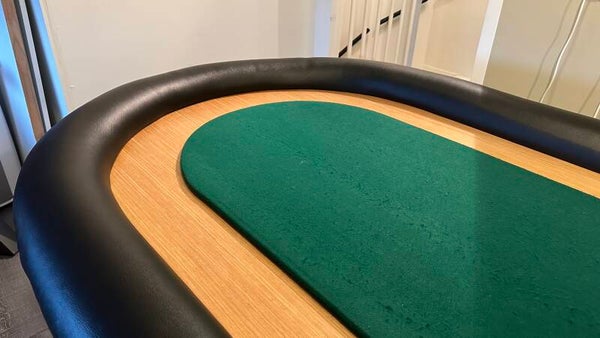 Deze handgemaakte pokertafel is een ideale toevoeging aan je mancave of kantine. Het royale formaat en de stevige constructie bieden comfortabele ruimte voor 8 personen, en op drukke avonden kunnen zelfs 10 spelers gemakkelijk aansluiten. De buitenrand, bekleed met luxe kunstleer, zorgt voor een comfortabele speelervaring. De handige houten rand, behandeld voor extra duurzaamheid, biedt ruimte voor fiches en drankjes, terwijl het speelveld overzichtelijk en vrij blijft. Het onderstel is vervaardigd uit robuust vurenhout, maar kan naar wens worden aangepast. Denk bijvoorbeeld aan stijlvolle stalen tafelpoten voor een unieke uitstraling.